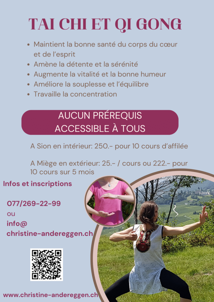 Miège: en extérieur, 25.- / 1 cours de 60 min ou 222.- / 10 cours sur 5 mois, inscription jusqu’à la veille au 077/269-22-99 ou par mail à info@christine-andereggen.ch