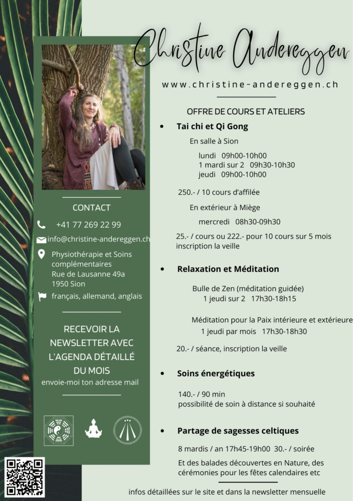 Pour le programme mensuel avec les dates, horaires et prix des cours, ateliers et soins ouverts à tous et sans abonnement, Cliquez ici.